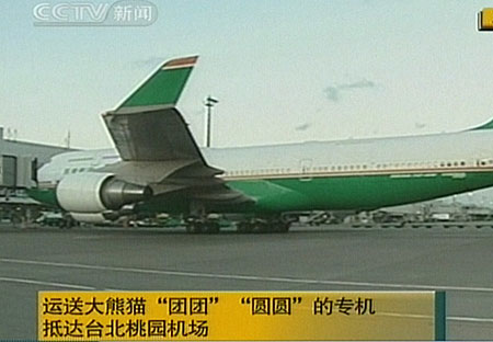 中新網臺北12月23日電 今天下午17時03分左右,大陸贈臺大熊貓“團團”、“圓圓”搭乘長榮航空公司波音747專機飛抵臺北桃園機場。