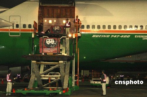 12月23日下午6時許,抵達臺北桃園機場的大陸贈臺大熊貓“團團”、“圓圓”經過檢疫程序后,它們的箱籠從長榮航空專機出艙。 中新社發 陳立宇 攝