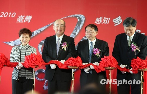 3月24日下午,“2010臺灣·感知多彩貴州”活動在臺北101大樓開幕,中國國民黨榮譽主席吳伯雄(左二)、貴州省副省長謝慶生(右二)為開幕剪彩。為期5天的“感知多彩貴州”活動,包括民族歌舞表演、民族工藝品和服飾展示、黔山名茶與國酒茅臺品嘗、貴州民族文化保護與傳承懇談會等。中新社發(fā) 耿軍 攝