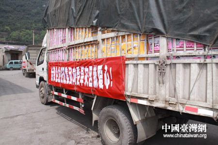 裝載著旺旺集團(tuán)捐贈(zèng)飲料的車正向?yàn)?zāi)區(qū)開去。