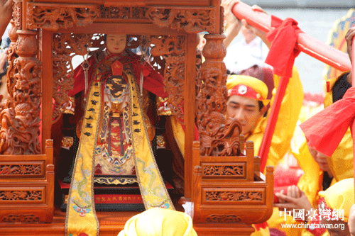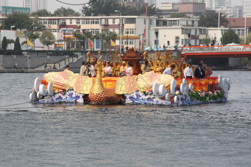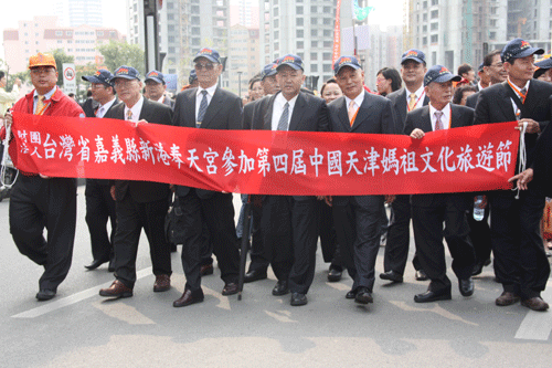 中國臺灣網10月4日消息 在第四屆天津媽祖旅游節的開幕式演出結束后,來賓和各界代表乘船并進行媽祖海河出巡活動,在河東區天妃碼頭舉行揭幕儀式,并在河東區天妃宮前廣場舉行迎駕媽祖、踩街和民俗表演等活動。(李典典 石慧)