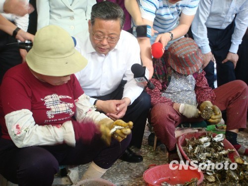 5月9日,正率團(tuán)在臺訪問的福建省長黃小晶(中)在臺南市參訪路上,下車走進(jìn)路邊人家,與正在剝海蠣的婦女親切交流。黃小晶5日率福建省經(jīng)貿(mào)文化交流團(tuán)抵臺展開為期6天的“走親訪友做生意”之行。 中新社發(fā) 羅欽文 攝