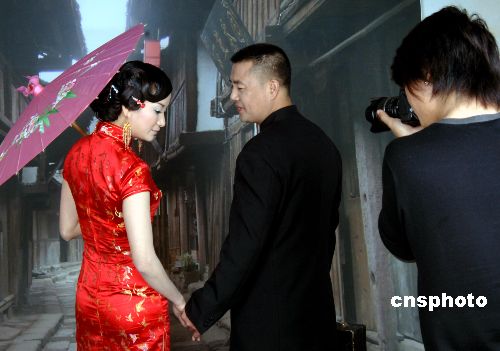 福州一知名臺資婚紗影樓的攝影師正在為一對新人拍攝中式風(fēng)格婚紗照。該臺資婚紗影樓2009年將與當(dāng)?shù)芈糜尾块T聯(lián)手推出臺灣旅游婚紗拍攝項目,希望受金融危機影響的生意“回暖”。 中新社發(fā) 劉可耕 攝
