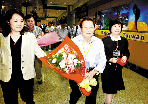 昨日,有著“華夏第一村”美譽的江蘇省江陰市華西村的老支書吳仁寶(中)率領該村赴臺旅游首發團抵達臺北。這是大陸第一個農村赴臺旅游團。華西村黨委書記吳協恩曾在今年5月舉辦的“華西誠信節”上宣布,華西村將組織1000名村民包機前往寶島臺灣觀光旅游,并將在那里開辦酒店和旅行社。