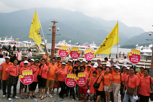 廣東省長黃華華所率領的廣東省經貿文化交流團,19日抵日月潭游湖,隨行還有廣東旅游團游客,他們高舉“臺灣廣東周、萬人游臺灣”招牌在水社碼頭合影。圖片來源:“中央社”