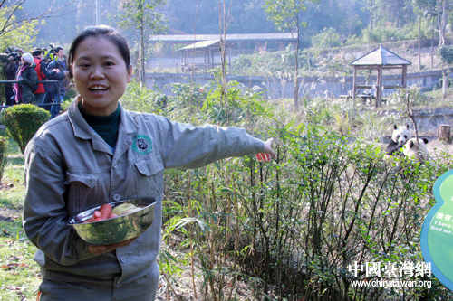 在地震中機(jī)敏逃生后的大熊貓“團(tuán)團(tuán)”和“圓圓”,現(xiàn)住在四川雅安碧峰峽大熊貓飼養(yǎng)基地,兩岸媒體到達(dá)時(shí),它們正在開心進(jìn)食。