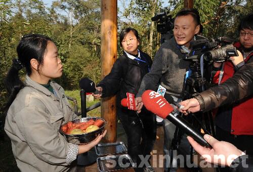 12月11日,臺灣媒體記者在采訪大熊貓“團團”“圓圓”的飼養員。 當日,來自海峽兩岸數十家媒體的記者來到中國保護大熊貓研究中心雅安碧峰峽基地,關注即將赴臺的大熊貓“團團”“圓圓”,了解它們的近況。目前,大熊貓“團團”“圓圓”的體重已分別達到112公斤和114公斤,兩只大熊貓每天要吃50公斤竹子。 新華社記者陳燮攝