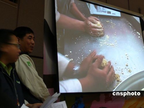 大陸贈臺一對大熊貓“團團”和“圓圓”二十三日晚間抵達臺北,住進臺北市立動物園的新光特展館。圖為動物園發言人金仕謙(左二)介紹大熊貓的精制飼料——窩窩頭的做法。 中新社發 路梅 攝
