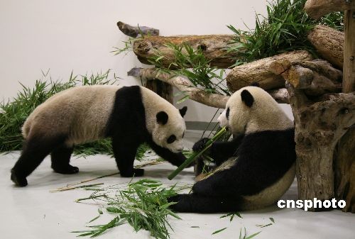 大陸贈臺一對大熊貓“團團”和“圓圓”12月23日晚間抵達臺北,住進臺北市立動物園的新光特展館。“團團”和“圓圓”抵達新家半個小時后開始進食。這是他們在臺北新家的第一餐。 中新社發 路梅 攝