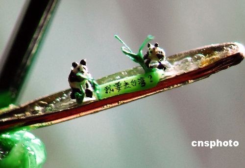 為了迎接12月23日大熊貓“團團”、“圓圓”的到來,臺灣著名微雕家陳逢顯特地花了半個多月的時間,以樹脂凝膠為材質,雕刻了一雄、一雌兩只坐在繡花針孔中的立體大熊貓,拉著寫有“我要去臺灣”的條幅。以表達他對團團、圓圓到來喜悅的心情。中新社發 陳立宇 攝