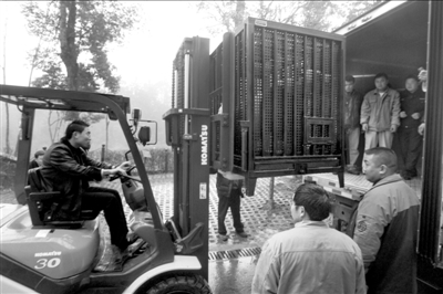 工作人員利用叉車將“圓圓”平穩送進專門設計的轉運車。王磊攝(圖片來源:京華時報)