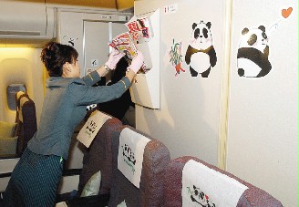 報道稱,為迎接“團團”、“圓圓”兩位貴客,熊貓專機設計的也是相當特別。走進機艙,映入眼簾的就是一幅大大的熊貓壁畫,飛機上還有許多可愛的熊貓插圖,就連乘客座位的椅套,也畫著相親相愛的“團團”、“圓圓”。