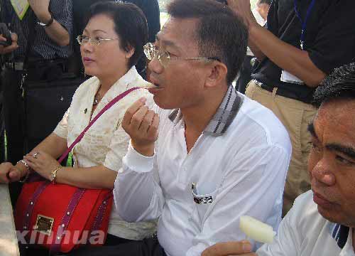 | 8月28日,訪問團團長、中國國民黨彰化縣黨部主任委員許福明(中)在品嘗豐水梨。當日,中國國民黨彰化縣黨部訪問團到青島市郊的臺資大華農場參觀。新華社記者許林貴 |