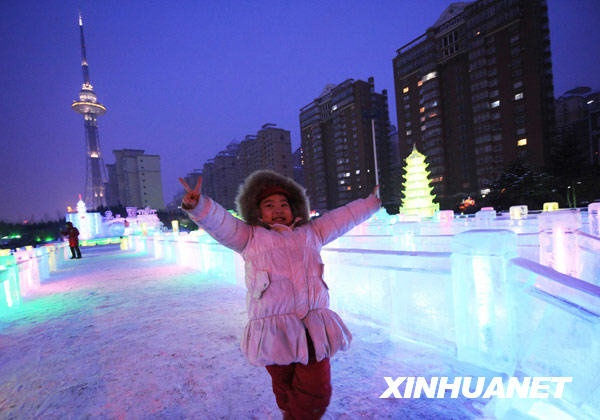 1月5日,市民在哈爾濱市一街頭冰景前游玩。新華社記者 王建威 攝