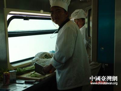 勉強支撐著身體,起了床,背起相機,拿著記事本,我第一個想去的就是餐車。快晚飯了,我想師傅們一定在工作了,到了餐車,看到師傅們在狹小的廚房里忙碌著,我不忍心去打擾他們,當他們炒好菜轉過身來的那一瞬間,我驚呆了,每個師傅都是插著氧氣管在那里工作,他們臉上顯示更多的卻不是疲憊,而是滿足,一種充滿幸福感的滿足。我拿著相機,哽咽著:“師傅,我能給您拍張照片么?”拍完照片,看著師傅忙碌的身影,我帶著極其復雜的心情離開了餐車,雖然我沒有用文字采訪到那些為我們這趟列車800多名旅客提供三餐服務的辛勞者,但是我想,這或許是最自然的方式,這份感動或許也最能打動網友的內心深處。