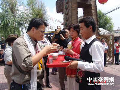 欣賞完了土族人民的精彩表演,兩岸記者還到土族農家做客,品嘗土族農家特色風味,兩岸記者們受到了土族人民的熱情接待。土族人民用土族的迎客禮儀來招待兩岸記者。土族農家全家在大門口外迎接兩岸記者,先獻上象征吉祥如意的哈達,敬兩岸記者們“進門三杯酒”,記者們進家門后,上炕入座后再敬“吉祥如意三杯酒”,招待記者的菜肴也是當地頗具代表性的農家風味,筵席結束后,主人還殷勤地為客人送上“上馬三杯酒”,預祝兩岸記者一路平安。兩岸記者也被土族人民的熱情好客深深感動。(謝曉萍)