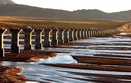 9月25日,青藏鐵路沱沱河段長江源頭第一特大橋從清澈的河流上跨過。青藏鐵路建設(shè)用于環(huán)保方面的投資達(dá)到20億元人民幣,約占工程總投資的8%。有“世界屋脊”之稱的