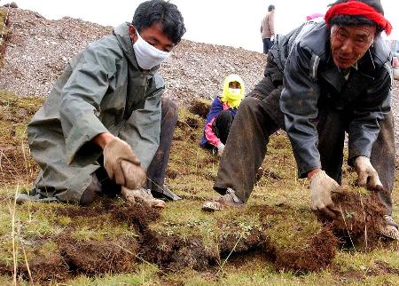 9月15日,西藏當(dāng)雄縣的牧民在青藏鐵路路基邊坡上移植草皮。青藏鐵路建設(shè)用于環(huán)保方面的投資達(dá)到20億元人民幣,約占工程總投資的8%。有“世界屋脊”之稱的青藏高原生態(tài)環(huán)境十分脆弱。青藏鐵路建設(shè)單位通過移植草皮、設(shè)施工便道、建立珍稀動(dòng)物觀察站和環(huán)保監(jiān)理等措施保護(hù)青藏高原的植被、動(dòng)物、水質(zhì)和自然景觀。