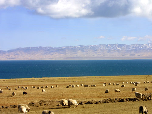 青海湖地處青海高原的東北部,這里地域遼闊,草原廣袤,河流眾多,水草豐美,環境幽靜。湖的四周被四座巍巍高山所環抱:北面是崇宏壯麗的大通山,東面是巍峨雄偉的日月山,南面是逶迤綿綿的青海南山,西面是崢嶸嵯峨的橡皮山。這四座大山海拔都在3600米至5000米之間。舉目環顧,猶如四幅高高的天然屏障,將青海湖緊緊環抱其中。從山下到湖畔,則是廣袤平坦、蒼茫無際的千里草原,而煙波浩淼、碧波連天的青海湖,就象是一盞巨大的翡翠玉盤平嵌在高山、草原之間,構成了一幅山、湖、草原相映成趣的壯美風光和綺麗景色。 青海湖的不同的季節里,景色迥然不同。夏秋季節,當四周巍巍的群山和西岸遼闊的草原披上綠裝的時候,青海湖畔山青水秀,天高氣爽,景色十分綺麗。遼闊起伏的千里草原就象是鋪上一層厚厚的綠色的絨毯,那五彩繽紛的野花,把綠色的絨毯點綴的如錦似緞,數不盡的牛羊和膘肥體壯的驄馬猶如五彩斑駁的珍珠灑滿草原;湖畔大片整齊如畫的農田麥浪翻滾,菜花泛金,芳香四溢;那碧波萬頃,水天一色的青海湖,好似一泓玻璃瓊漿在輕輕蕩漾。而寒冷的冬季,當寒流到來的時候,四周群山和草原變得一片枯黃,有時還要披上一層厚厚的銀裝。每年11月份,青海湖便開始結冰,浩瀚碧澄的湖面,冰封玉砌,銀裝素裹,就象一面巨大的寶鏡,在陽光下熠熠閃亮,終日放射著奪目的光輝。