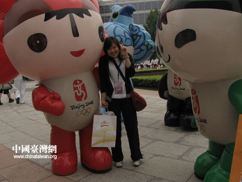 會場外的福娃不僅會自由走動,還經常會“欺負”我們的臺灣小客人,不時會聽到臺灣學生在大喊:險些被強吻……福娃,你怎么又拍我?!臺北市女子高級中學樂旗隊的領隊說,她最喜歡福娃晶晶,因為非常喜換大熊貓。不過,我們現場的晶晶可是調皮的很,不停地拉著同伴去“擁抱”我們的臺灣客人。