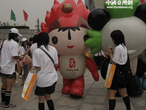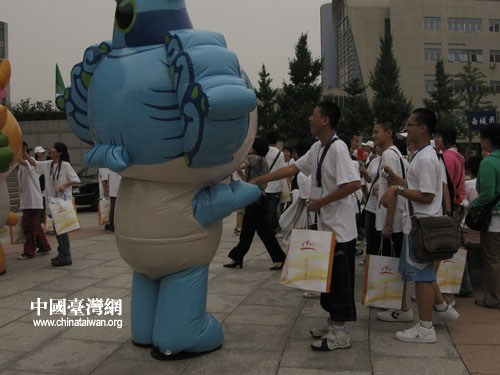 開幕式后,會場外面五個可愛、活潑的福娃引起了臺灣學生的極大興趣,學生們紛紛拿出相機爭相與福娃拍照。淘氣的福娃在場地上走來走去,不時地與臺灣學生玩笑打鬧,引得臺灣學生陣陣歡呼。