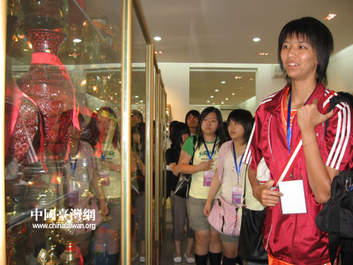 臺灣師生到達101中學后,雙方老師就各自的辦學特色和經驗進行了交流。在參觀101中學校史館時,臺灣學生們則對校史館陳列的一排排的獎杯充滿了好奇。