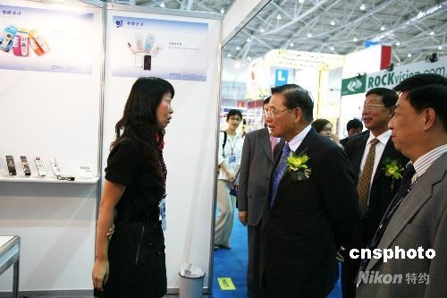 十月七日,二00八年海峽兩岸電子展在臺(tái)北世貿(mào)中心南港展覽館舉行,“海基會(huì)”董事長江丙坤出席開幕典禮,對(duì)大陸企業(yè)來臺(tái)參展表示歡迎,希望兩岸經(jīng)貿(mào)合作更加緊密,期待大陸人員今后來臺(tái)不必繞道。來自大陸的一百五十余家企業(yè)、經(jīng)貿(mào)團(tuán)體分參展團(tuán)與觀展團(tuán)參加此次電子展,臺(tái)灣參展企業(yè)達(dá)千余家。大陸與臺(tái)灣參展企業(yè)數(shù)與參展人數(shù)均創(chuàng)歷年之最。 中新社發(fā) 楊旭 攝