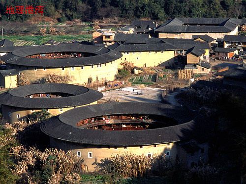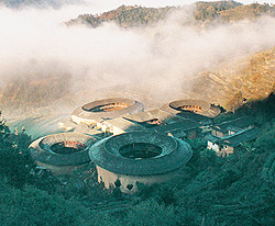 風格奇異的土樓民宅散布在閩西的永定、武平、上杭及閩西南的南靖、平和、華安、漳浦等地。其造型、裝飾和建造工藝世所罕見,土樓,俗稱“生土樓”。因其大多數為福建客家人所建,故又稱“客家土樓”。它是以生土作為主要建筑材料,摻上細沙、石灰、糯米飯、紅糖、竹片、木條等,經過反復揉、舂、壓建造而成。樓頂覆以火燒瓦蓋,經久不損。土樓高可達四五層,供三代或四代人同樓聚居。
