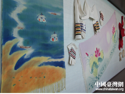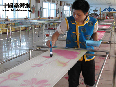中國臺灣網7月23日包頭消息   “原來漂亮的披肩就是這樣制作的。”昨天下午,兩岸記者在包頭見識到了羊絨手繪披肩的全部制作過程。(張弛 攝)