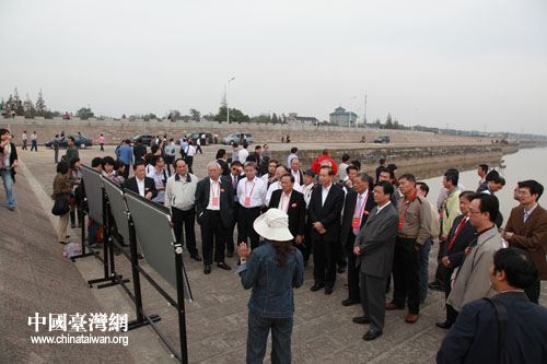 兩岸與會代表考察錢塘江海寧段水利項目(浙江臺辦 王建 攝)