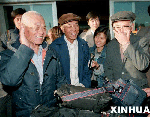 1987年11月4日,86歲的臺灣同胞沙先生(左一)懷著思鄉之情孑然一人經香港回到大陸探親,與他失散38年的親弟弟沙教授(右一)重逢在北京首都機場。不禁感慨萬端,悲喜交集。新華社發