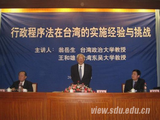 你好臺(tái)灣網(wǎng)4月27日消息 4月22日下午,應(yīng)山東大學(xué)校長(zhǎng)徐顯明教授的邀請(qǐng),臺(tái)灣政治大學(xué)翁岳生教授、東吳大學(xué)王和雄教授在山大新校邵館一樓報(bào)告廳作一場(chǎng)題為《行政程序法在臺(tái)灣的實(shí)施經(jīng)驗(yàn)與挑戰(zhàn)》的學(xué)術(shù)報(bào)告,報(bào)告由山東大學(xué)法學(xué)院院長(zhǎng)齊延平教授主持。