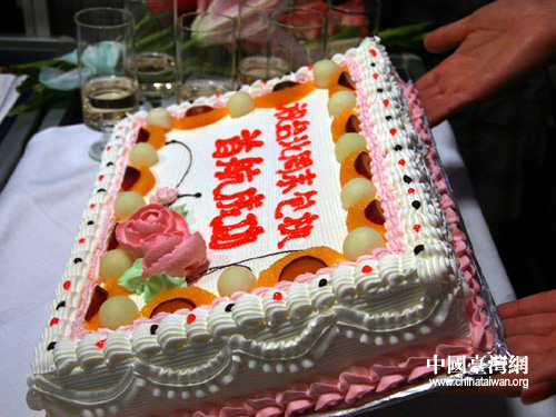 國航在兩岸首航周末包機上準備慶祝蛋糕,祝臺北周末包機首航成功。(攝影 李徽)