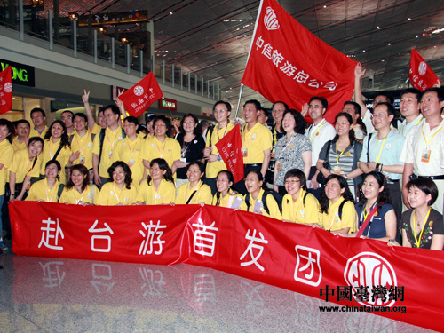 “赴臺游首發團”,即將踏上寶島的大陸游客無比欣喜。(攝影 李徽)