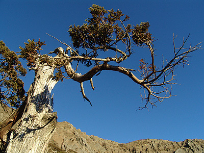 經過冷杉林,過了往主峰與南峰登山到的交叉口后,地形開始逐漸空曠起來,再往前就要進入碎石區了。碎石區主要的植物仍是以臺灣圓柏為主,看的圓柏盤根錯節的枝干,各種扭曲的姿態讓人感到這種植物的堅韌生命力,穿過石縫的樹根,就讓圓柏硬生生的矗立在碎石惡地上。