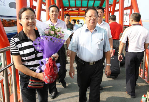 金門縣副縣長楊忠全在金門碼頭迎接巴莫阿依一行。(攝影:《民族畫報》楊博)