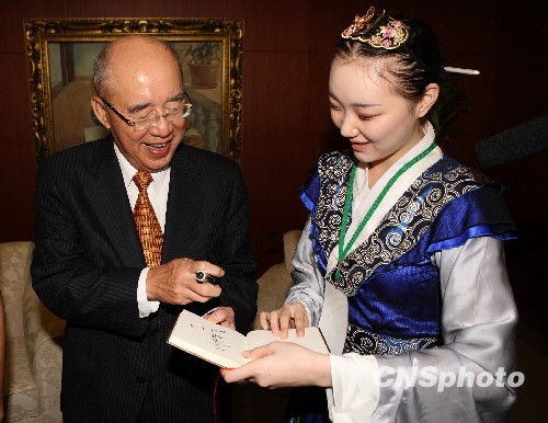 中國國民黨主席吳伯雄9月23日在臺北會見了以國家民委副主任楊健強為總顧問的大陸少數民族大學生文化交流團一行。吳伯雄在會見中對此次文化交流團的民族歌舞演出表示非常期待。他說,此次演出的收入將捐給臺灣災區,這令人感佩。大陸少數民族大學生文化交流團在為期兩周的時間里將在臺北、臺中和金門等地進行多場慈善演出,并和臺灣六所大中學校的學生進行交流。 中新社發 楊博 攝