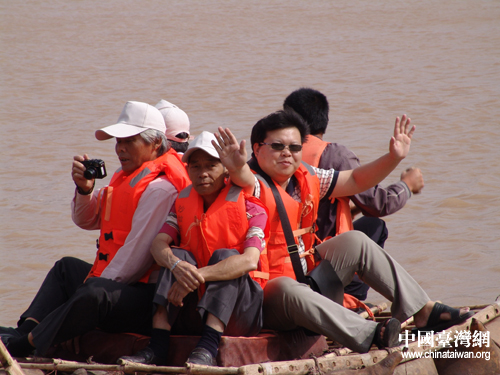 7月10日,在寧夏參加“海峽兩岸記者聯合采訪活動”的兩岸記者一行參觀游覽沙坡頭旅游區治沙工程。圖為記者乘羊皮筏在黃河漂流。