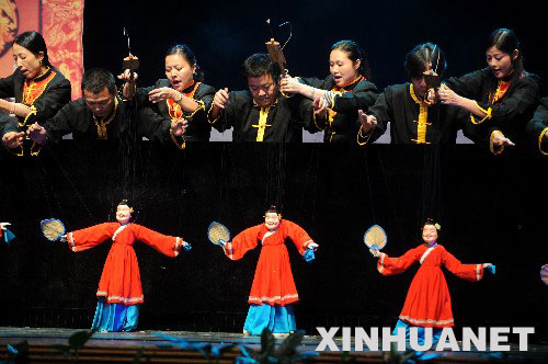 11月26日,福建省泉州市木偶劇團(tuán)和漳州市木偶劇團(tuán)的演員在表演木偶劇《嘉禮獻(xiàn)瑞》。當(dāng)日,首屆海峽兩岸(廈門(mén))文化產(chǎn)業(yè)博覽交易會(huì)開(kāi)幕式文藝晚會(huì)在廈門(mén)人民會(huì)堂舉行,來(lái)自海峽兩岸的藝術(shù)家同臺(tái)演出,共敘文緣。 新華社記者 姜克紅 攝 |