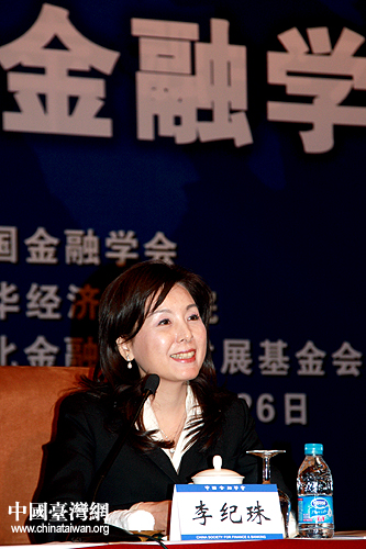 李紀珠以臺灣金融代表團首席顧問的身份在研討會閉幕式上進行發言。她表示:在兩岸實體經濟聯系愈發緊密的背景下,雙方金融合作已是大勢所趨。兩岸間對于加速金融監理機制的建立已有強烈共識。希望雙方盡早建立金融監管制度,為兩岸金融合作實現突破性進展、攜手對抗全球金融危機奠定堅實基礎。