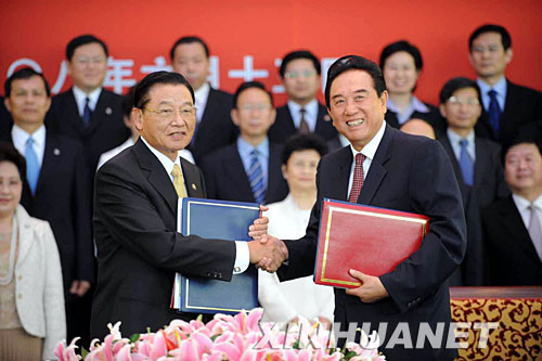 6月13日9時許,海協會與海基會在北京就兩岸周末包機與大陸居民赴臺旅游簽署協議。這是海協會會長陳云林和海基會董事長江丙坤在簽字儀式上握手。 新華社記者李曉果攝