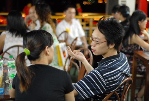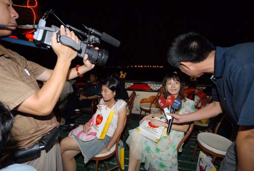 紅隊11號的漂亮小姐,受到眾男士青睞。最早給11號寫傳情卡片的綠隊23號帥哥,1米75左右的個,臉長得很有型,頭發被摩絲打得油光發亮,特有精神。他說,自己一上船對紅隊11號特有感覺。此時的紅隊11號,對面正坐著一個人高馬大的黃隊78號,兩人聊得甚歡。當綠隊隊長受委托把綠隊23號的卡片送至紅11號時,黃隊78號甚是驚訝且略帶“惱怒”,并當場微笑“叫戰”:“哪位帥哥來搶我美女,叫他來坐在我旁邊(比試比試)!”逗得紅隊11號忍笑不止。而綠隊23號,因為羞澀,顯得怯場,直等到黃隊78號離開,才與紅隊11號見面開聊。