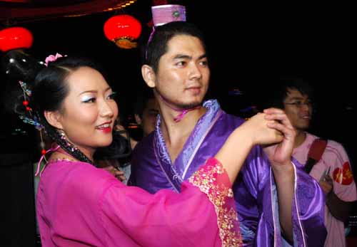 身著古裝的“牛郎織女”首先出場讓人仿佛有時光倒流的感覺。晚會立即進入熱鬧的游戲互動。第一個游戲“5毛1塊”新鮮有趣,讓參加者一下子活絡起來。