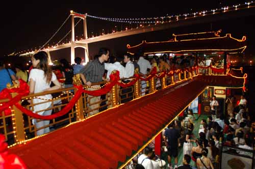 夜幕落下,華燈初上。找到組織后,貼上自己的號碼,在歡樂的鑼鼓聲中,經過長長的紅地毯走上美麗的仿古游船。