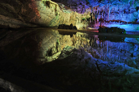 水洞“小三峽”兩岸奇峰聳峙,怪石猙獰,河水夏日冰冷徹骨;干洞和迷津洞內鐘乳石保存完好,奇形怪狀,千姿百態,巨柱擎天、長龍橫臥、雄鷹高踞,帷帽低垂,百步天梯,水鏡仙境,美不勝收。不過,龍麟宮最讓人震驚的景觀是里面的魔幻倒影,在一處平靜如鏡的水面上,倒映出大峽谷、兵馬俑、美女寶馬等景觀,美侖美奐。肖進安 攝