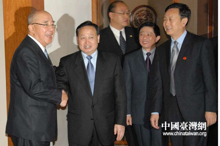 省委書記、省人大常委會主任羅清泉(左二)昨日在臺北會見國民黨榮譽主席吳伯雄(左一)。 圖片來源:湖北省臺辦 陸勝 攝