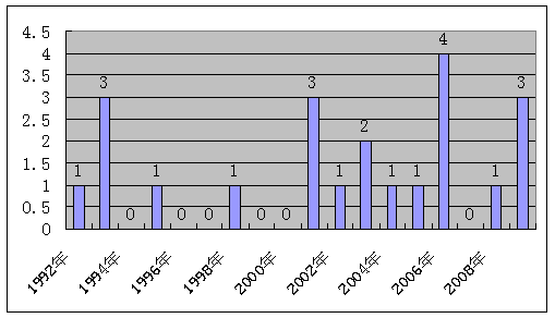 從臺資企業落戶眉山的時間來看,最早于1992年臺胞曾再發在眉山投資開辦誼園園林綠化有限公司開始,18年間有12個年頭每年都有臺資企業落戶,臺資企業入駐眉山的最高峰時段集中在2006年,落戶了4家。投資額在3500萬元以上的7家臺企除眉山統一企業有限公司落戶于1993年,東坡區大亨餐廳落戶于1995年外,其余5家均為2001年眉山建市后落戶。如圖: