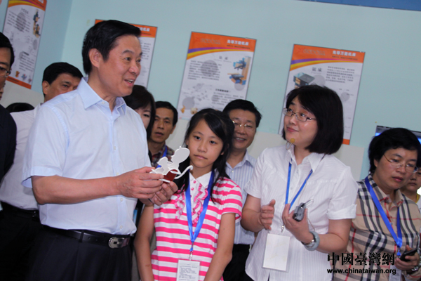 應中共四川省委書記劉奇葆邀請,臺灣云林縣、南投縣和彰化縣的105名師生,由臺灣民意代表馬文君、王惠美帶隊,赴四川參加第三屆“臺灣學生天府夏令營”活動。圖為劉奇葆饒有興致地欣賞臺灣小朋友制作的模型。(中國臺灣網 王偉 攝)