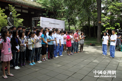 7月4日下午,參加第三屆“臺(tái)灣學(xué)生天府夏令營(yíng)”活動(dòng)的105名師生與成都七中的學(xué)生們一道漫步杜甫草堂,聽取巴蜀文化講座,共同吟誦“詩圣”杜甫的名篇佳作,感受中華文化源遠(yuǎn)流長(zhǎng)。(中國(guó)臺(tái)灣網(wǎng) 王偉 攝)