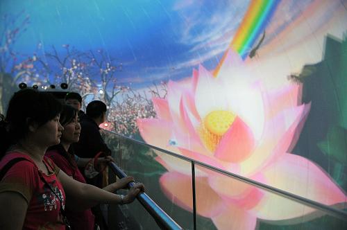 5月25日,來賓在臺(tái)灣館體驗(yàn)炫目的4D影像。新華社記者 何俊昌 攝